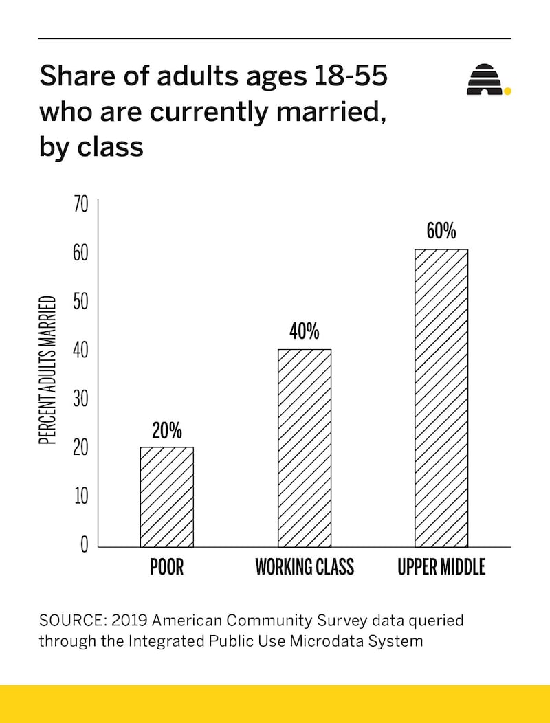 No more. A new report we published at the Social Capital Campaign spotlights a growing marriage divide that separates Americans by class and education. Of 18- to 55-year-olds, the share of those who are married from an upper-class background is 60%. However, this figure falls to 20% for the poor. (It is 40% for the working class.) Again, what is especially striking about this divide is that it was basically nonexistent in the 1970s.