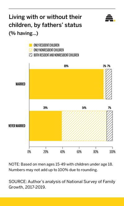 Obviously, it is much easier to provide direct care to your children if you live with them. And Wang finds that nearly “90% of married fathers live with their children, with only 3% having only nonresident children and 7% having both resident and nonresident children. On the other end, only about 40% of never-married fathers live with their children. A majority of never-married fathers live apart from either all (54%) or at least one of their children (7%).”
