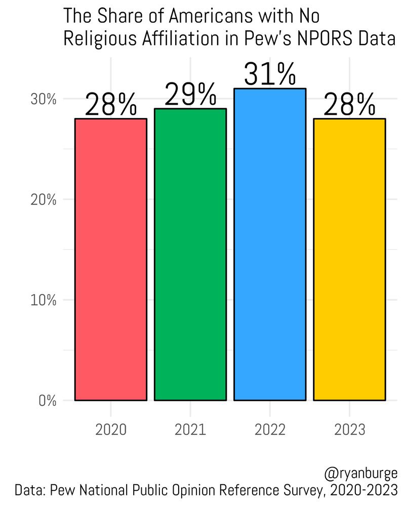In both graphs, you can see a dip at the most recent wave of data. In other words, three legitimate surveys conducted by three different organizations all triangulate on a potential plateauing of the rise of the nones.