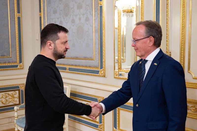 “Welcome,” says President Volodymyr Zelenskyy, nodding as he extends his hand to greet each guest into this boardroom of pearl blue upholstered chairs that match the length-of-room board table. In simpler times, this could be a beautifully set dining room table in an estate. But today a microphone sits at each place with a simple pen and pad of paper.