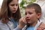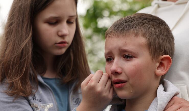 Today those emotions bubbled back up for Yaroslav. His face crumpled. His mother stooped down, holding his head into her neck. He broke out in uncontrollable sobs. His sister tried to console him, wiping his face and pulling his head into her chest.