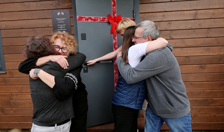 But today, next to the empty foundation, there was a new, four-bedroom modular home waiting for them. A red and white ribbon was tied around the front door. It is a fresh start for the Onischuk family.