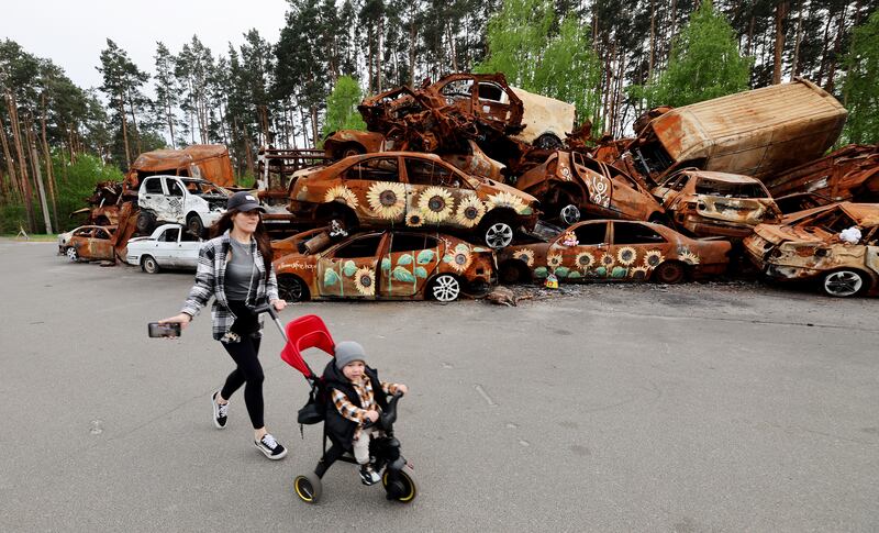 Today, a mountain of rusted and ravaged cars sit on the side of a road near Irpin. It has since turned into a chilling monument to the killed civilians. Some of the cars are painted with colorful sunflowers, a symbol of peace in Ukraine.