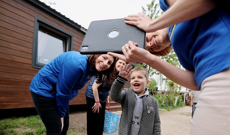 As her team prepared to give the home’s keys to the Onischuks, Miller held a tablet so a remote representative of the home’s donors, the Utah-based nonprofit, the Stirling Foundation, could see and speak to the family. Several members of a delegation from Utah, visiting Ukraine on a whirlwind trade and humanitarian mission, also joined to witness the family’s coming home.