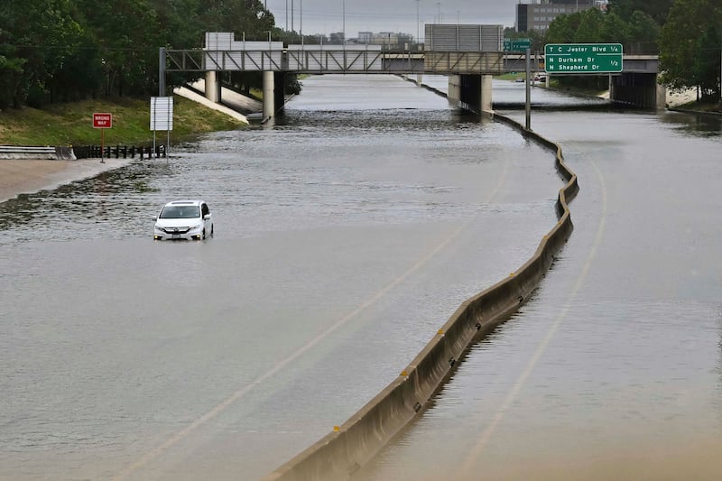 A vehicle is stranded in high waters on a flooded highway at I10 and Washington in Houston, on Monday, July 8, 2024, after Beryl came ashore in Texas as a hurricane and dumped heavy rains downtown. | Maria Lysaker