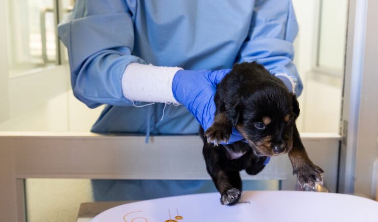 There are two sides of the Puppy Admissions building, and due to how easily infection and disease can spread from side to side, the caregivers have their hygienic procedures organized down to the nitty-gritty details. Each side of the puppy clinic has separate airflow, as to not spread airborne sicknesses, and both Blair and Schobert change their shoes after working on each side. When physically working with the dogs and puppies, they suit up in gloves and surgical gowns.