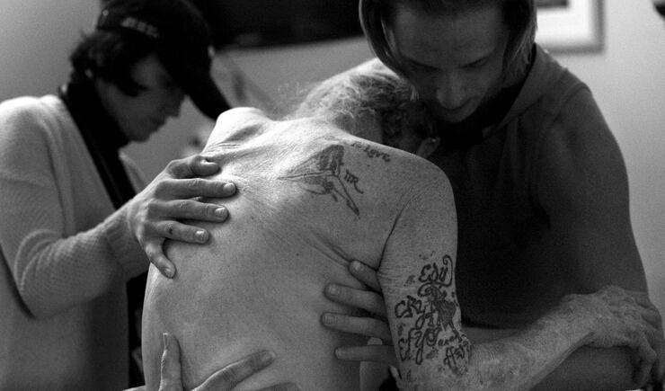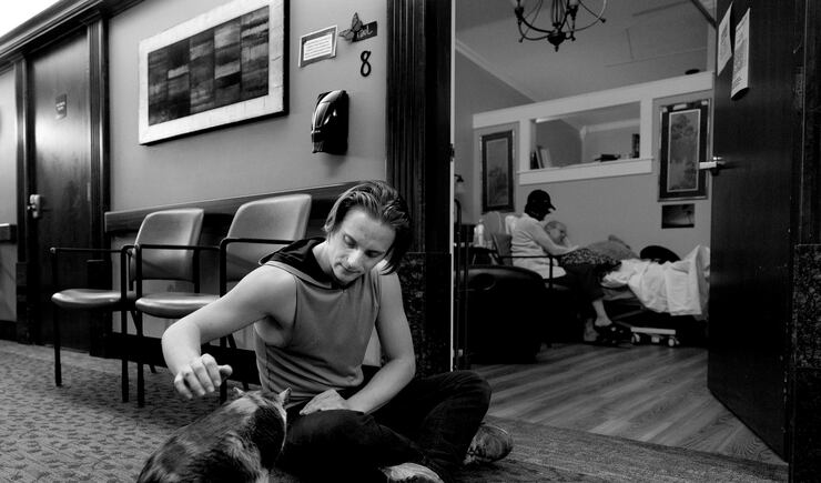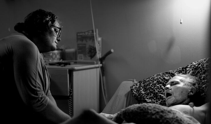 As Paul Youngblood lies withering and fragile in his narrow bed, Bernard, the stuffed dog pillow he loves, is tucked gently against his legs. Those around him are careful to make sure someone holds his hand. He is sociable by nature and loves touch, so the death doula switches hands with a volunteer with whom he’s close. Before she removes her hand hours later, another hand takes its place.