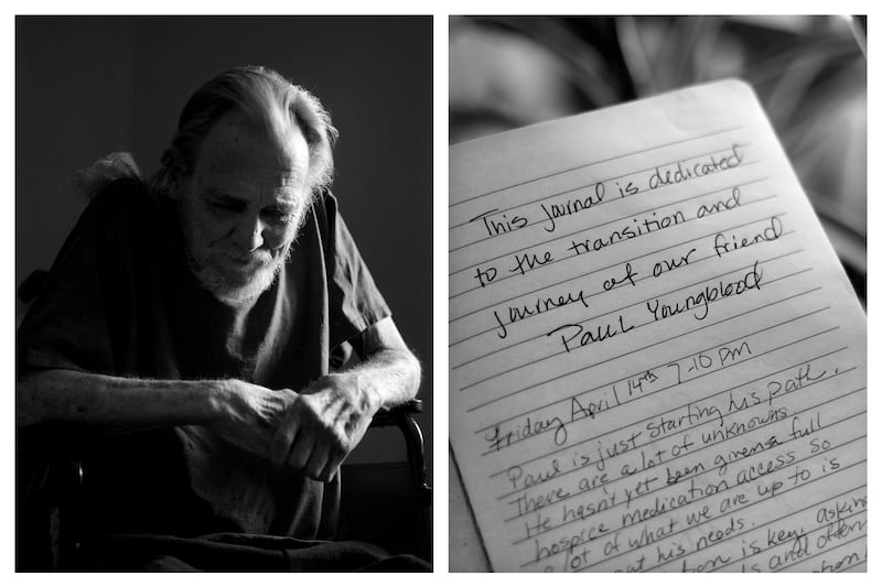 In the diary that volunteers kept of Paul Youngblood’s final weeks, there are stories of losses and gains and suffering. He loved playing games like Battleship, but was often too tired. He yearned for more time with his family and took comfort in the sounds of the ocean on a volunteer’s phone because he’d grown up in California and body surfed when his own body was young and strong and not yet broken.