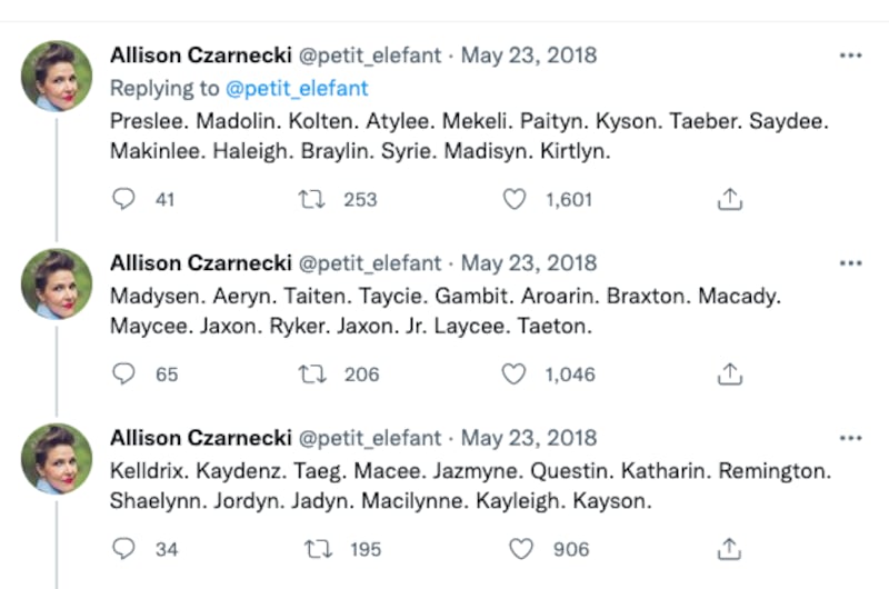 And, then, in 2018 Twitter user Allison Czarnecki tweeted a series of uniquely Utah names she mined from her son’s junior high school yearbook.