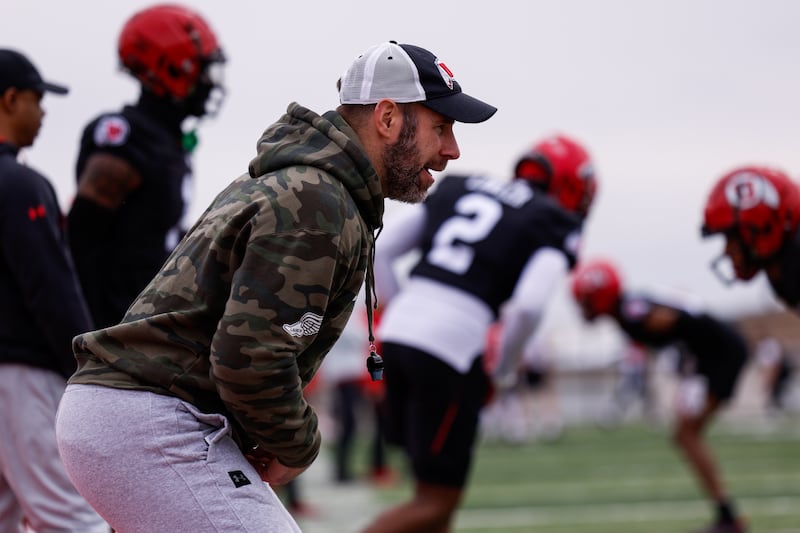 Utah defensive coordinator and safeties coach Morgan Scalley works with players during first day of spring camp in Salt Lake City on Tuesday, March 21, 2023. | Hunter Dyke/Utah Athletics