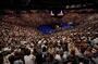 Before his talk, the audience sang, “We Thank Thee O God for a Prophet.” After his talk, President Nelson stood, pointed at and waved to each section of the arena, drawing smiles and chuckles. As he left, students continued to smile lovingly at him.