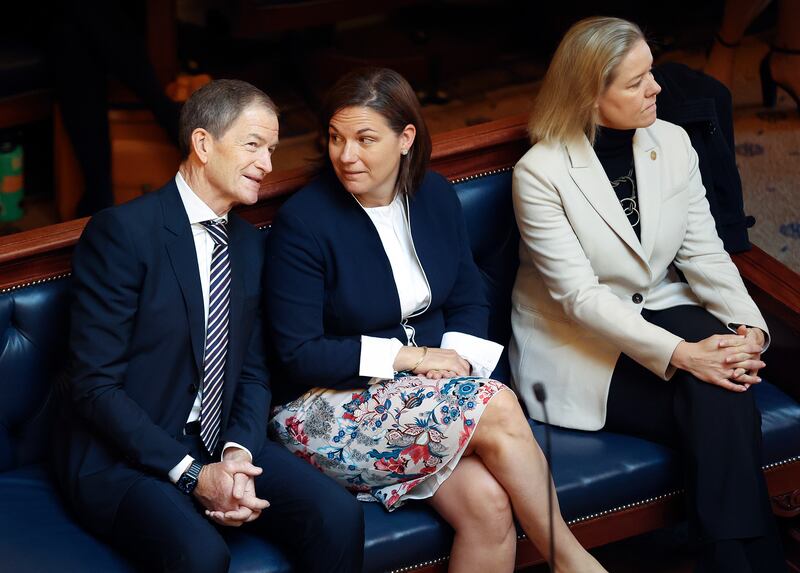 Gene Sykes, U.S. Olympic and Paralympic Committee board chair, left, Catherine Raney Norman, four-time Olympic speedskater and Salt Lake City-Utah Committee for the Games Chair, and Sarah Hirshland, U.S. Olympic and Paralympic Committee president and CEO, wait to be recognized in the Senate chamber at the Capitol in Salt Lake City, on Thursday, Feb. 16, 2023. | Kristin Murphy, Deseret News