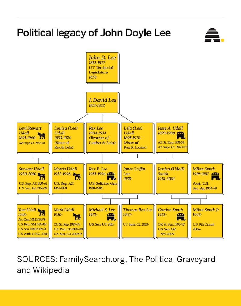 Among Lee’s most loyal defenders was his son John David Lee, whose mother was Lee’s 14th polygamous wife. And it was from John David that the Lee-Udall political progeny sprang.