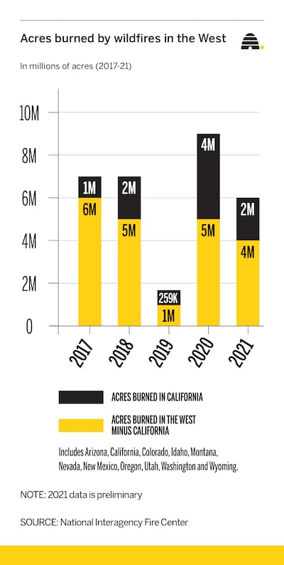 National Interagency Fire Center data shows that about 40% of fires in the West since 2017 were in California, which accounted for more than a quarter of all acres burned on average, killing residents, forcing evacuations, damaging property and spewing air pollutants into other states. Six of the seven largest fires in California occurred in 2020 or 2021, according state records.
