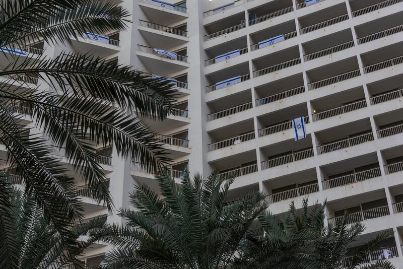 Outside, the Dead Sea’s turquoise water, the soft breeze, the white sandy beach — it seemed almost cruel: an awful reminder of how beautiful life can be, how in another time the people who now made the resort home would be here to vacation, to laugh, to play games, to doze in the sunlight with warm sand at their feet. Now, there were Israeli flags hanging from balconies and the feeling was more of a way station between two realms of existence.