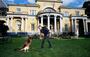 The house is painted in the pastel yellow of an Easter egg with roman columns and a large lawn out front. It is surrounded by a tall wall and an iron gate, and anyone who wants to enter must first present credentials to two guards who stand sentry outside in a small security shed.