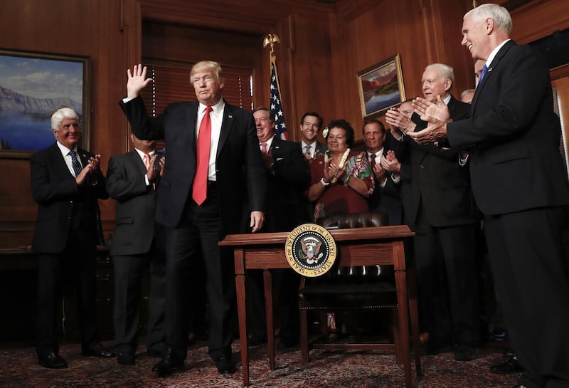 President Donald Trump acknowledge applause after signing an Antiquities Executive Order during a ceremony at the Interior Department in Washington, Wednesday, April, 26, 2017. Th president is asking for a review of the designation of tens of millions of acres of land as "national monuments." Front row, from left are, Rep. Ben Bishop, R-Utah, the president and Sen. Orrin Hatch, R-Utah.| AP Photo/Carolyn Kaster