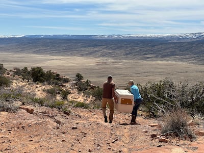 Later that evening, at the base of Vermillion Cliffs, more Condorks joined to observe the progress of the birds that had been released a few weeks earlier. The biologists’ shadows stretched long as they peered into their scopes. “I’ve got eyes on 33,” one said into her radio. “Copy that,” Bode replied from the top of the cliff, voice gravelly through the airwaves. If a bird settles in a spot that makes it vulnerable to predators, Bode’s job is to scare it off by any means necessary — yelling, waving arms, sometimes howling like a coyote — in a teaching process biologists call hazing. Another Condork followed 1083 through his scope as the youngling attempted a shoddy landing. “My man!” he exclaimed, cheering him on for a second attempt.