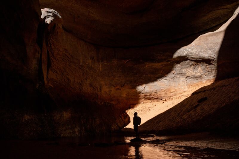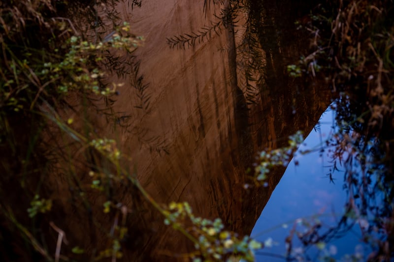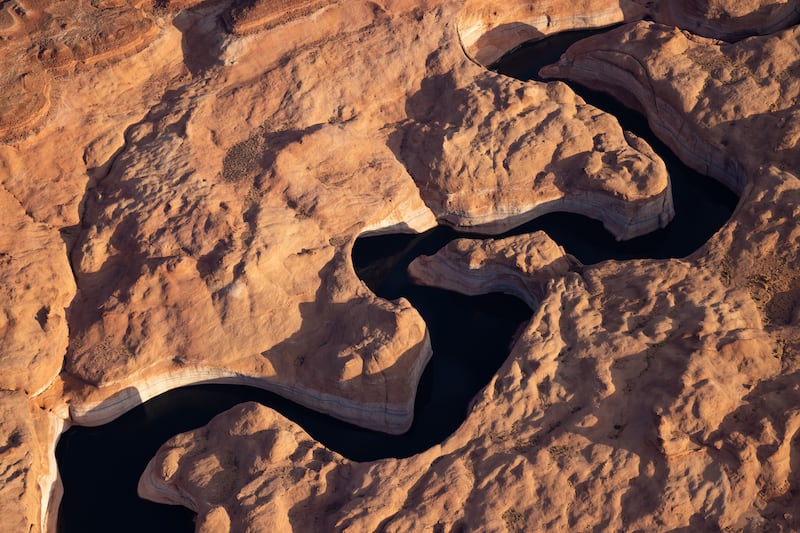 In the part of a canyon still flooded by Lake Powell, the world is silent and still. The vertical canyon walls hit glassy, dark water and are reflected back toward the sky. Maybe a fish jumps. A crow calls. But mostly it is a hard intersection of rock and water.
