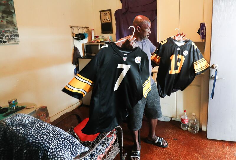 This was his porch, in front of his house, filled with his belongings: a bed, a TV, cupboards filled with food, and a place to hang his Pittsburg Steelers jerseys. The micro home, not a lot more than 200 square feet, isn’t much — but it is his.