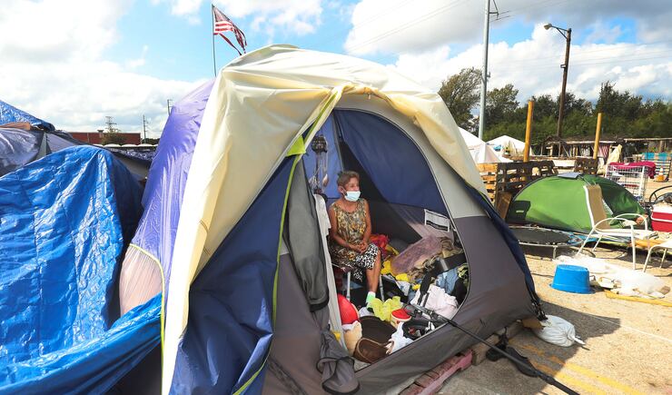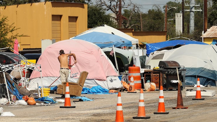 One is a state-sanctioned tent city, tucked — practically hidden — away in an industrial area just north of the Austin-Bergstrom International Airport. Tents, tarps, makeshift fences made out of pallets and port-a-potties sit on a hot slab of asphalt.