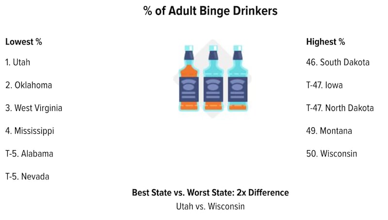 The state also has the lowest percentage of adults who are binge-drinkers and the lowest alcohol consumption per capita by far, with the state’s estimated 17.7 gallons per resident per year about half the national average of 34 gallons — 8 gallons below the next state, Maryland, and 42 less than New Hampshire. (Idaho comes in third, at 26.5 gallons per person.)