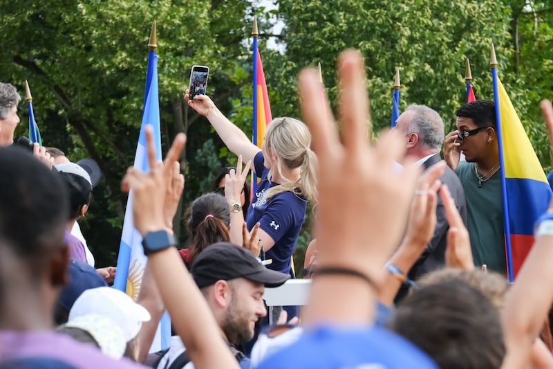 Olympian Lindsey Vonn waves to more than 500 youth from 34 nations gathered in Paris’ oldest park, Le Jardin d'Acclimatation, for the Sport dans la Ville’s Festival 24 on Thursday, July 25, 2024. During the event, the SLC-UT 2034 committee announced a partnership with Paris-based Sport dans la Ville. | David Jackson, Park Record