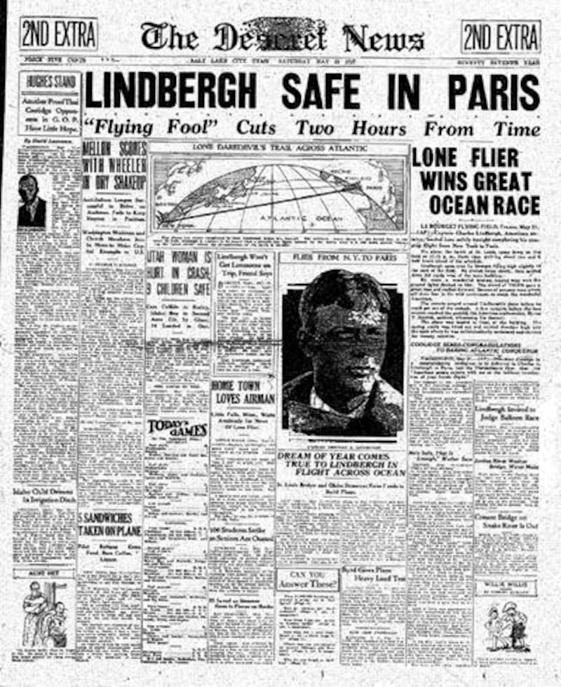 Much of the front page of this Saturday issue of the Deseret News was dedicated to the aviator and his voyage.
