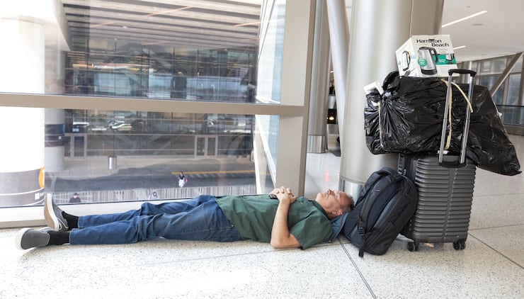Chet Thomas rests while waiting to be picked up by family after a long and complicated weekend of traveling, at Salt Lake City’s international airport on Monday, July 22, 2024. A software issue has caused global computer problems for many air carriers. | Brice Tucker, Deseret News