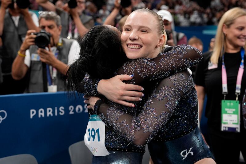 Simone Biles, left, and Jade Carey, of the United States celebrate after competing on the uneven bars during a women's artistic gymnastics qualification round at Bercy Arena at the 2024 Summer Olympics, Sunday, July 28, 2024, in Paris, France. | Charlie Riedel